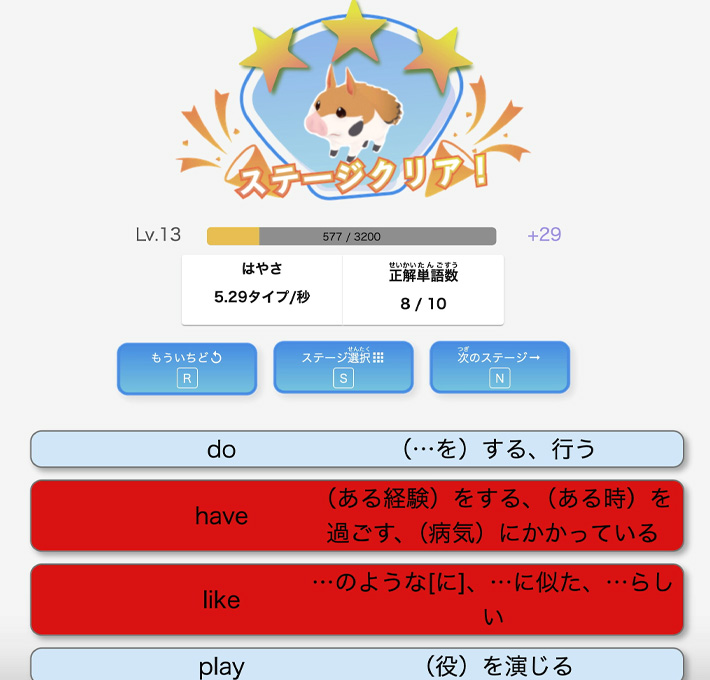 聞き取りステージで間違えた問題は、自動的に 復習対象の単語へ登録されます。