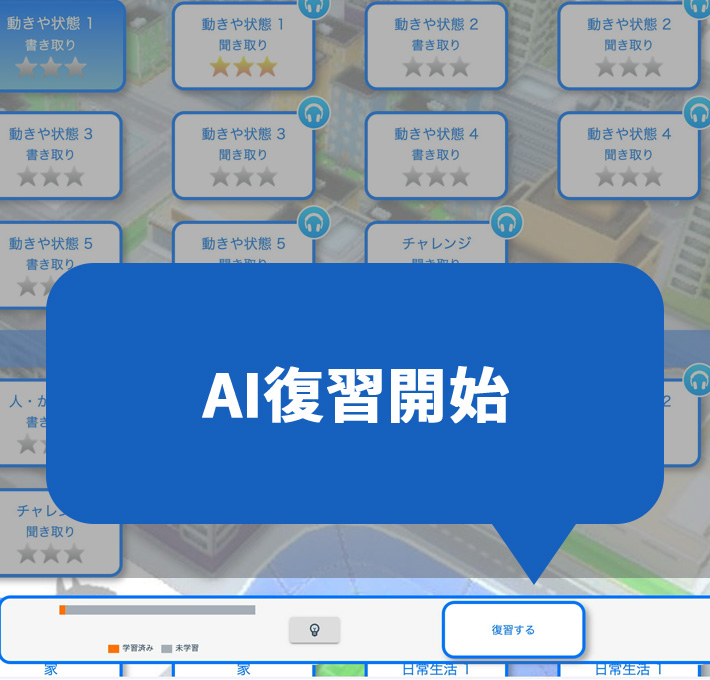 復習対象の単語があると、ステージ一覧画面の下部の 「復習する」ボタンが押せるようになります。 復習対象の単語はSTEP 1.で追加された単語だけでなく、 時間が経って忘れてしまっていそうな単語をAIが自動で追加します。