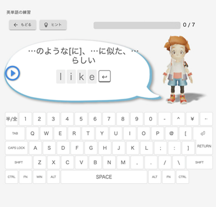 カリキュラムは音声を聞き、綴りを見て練習する書き取りステージと、音声と日本語訳から正しい英単語をタイピングする聞き取りステージで構成されます。 聴く力が同時に鍛えられるのはデジタル教材の大きなメリットです。